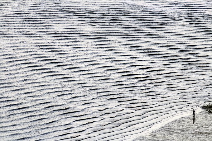 However, large, fast-moving container ships often steam past South Beach as they head to or depart from the Seattle shipyards. The energy generated by plowing through water from the ship's bow sends out trails of V-shaped waves. These ships produce waves of remarkable uniformity and size, lasting for half an hour and reaching 3 to 6 feet, large enough for a small group of Puget Sound surfers. As shown in this photograph, there are times when an oscillating swell created by wind and tidal currents courses diagonally to the ship waves, resulting in a geometric, rippling pattern called a cross sea, which creates a subtle moiré pattern.