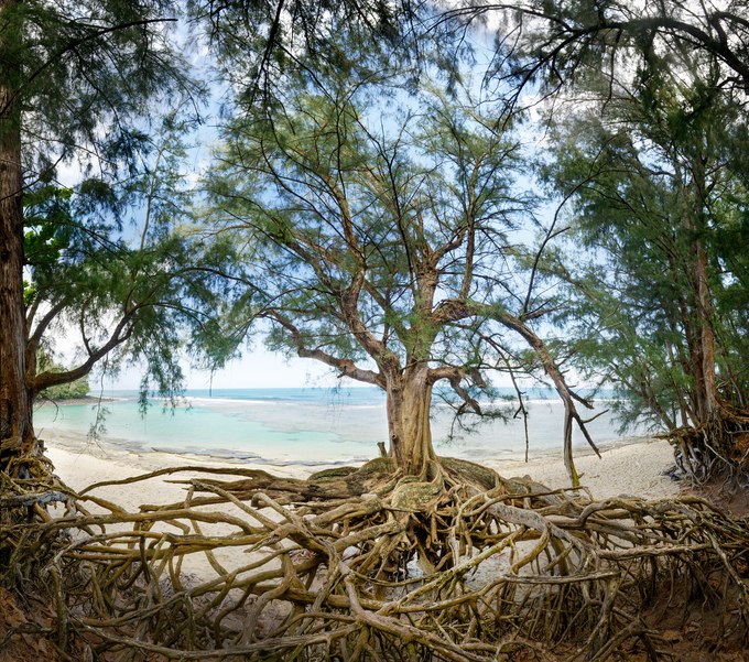 Evidence of this erosion is the exposed roots of Casuarina trees on the beach terrace. As I approached the beach, this tree caught my attention as it almost seemed to hover in the air, its tethered roots anchored to the ground. Though they might appear indigenous to Kauai, the non-native Casuarina trees were planted in the 1870s as windbreaks. They thrive in the shoreline's saline soil, grow rapidly, and have a short lifespan. After planting, they invade an area, edging out other plants by emitting toxins that prevent them from taking root, leaving the ground bare beneath their thick canopies.